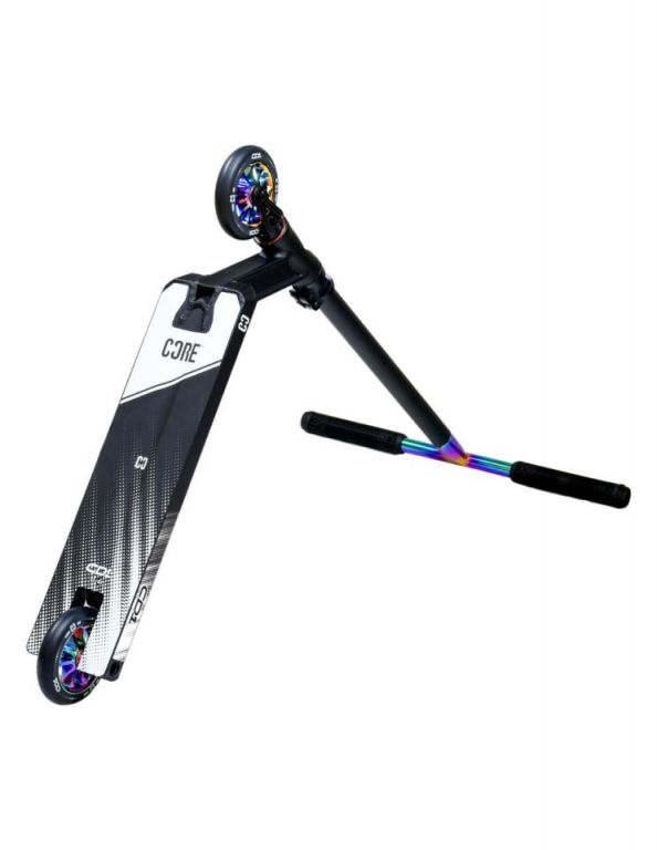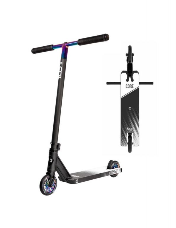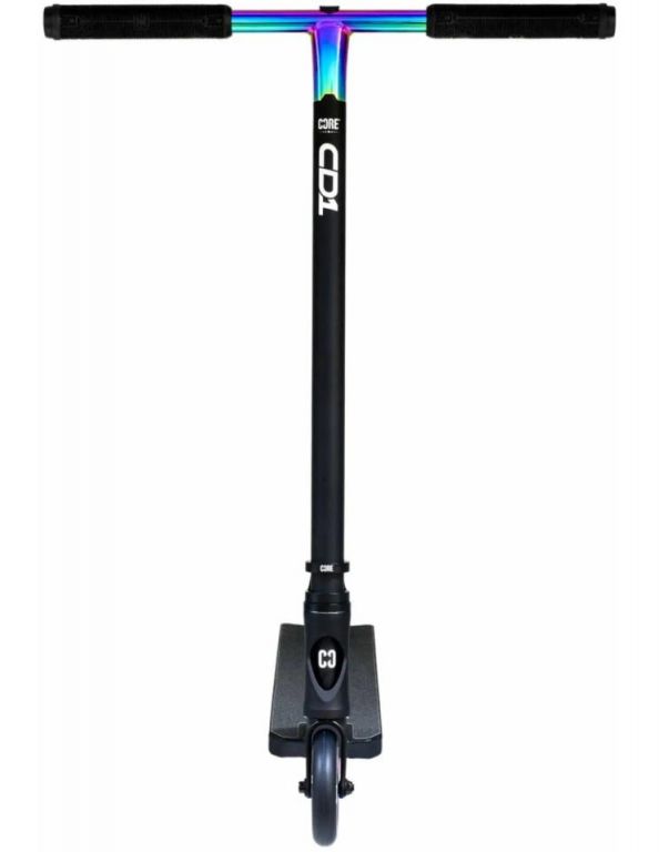 DescripciónScooter CORE CD1: la máxima tecnología en scooters para empezar.El CORE CD1 no es solo un patinete, es una pieza de ingeniería diseñada específicamente para riders principiantes que buscan iniciarse en el freestyle con equipo de calidad superior. Cada componente ha sido seleccionado cuidadosamente para ofrecer durabilidad, ligereza y un rendimiento óptimo en el skatepark.Manillar de dos piezas: eficiencia y sostenibilidad.El innovador manillar de dos piezas, pendiente de patente, está diseñado para maximizar la resistencia y reducir el impacto ambiental.Dimensiones precisas: Mide 560 mm de alto y 520 mm de ancho, lo que lo hace ideal para riders jóvenes.Puños Core Premium de 165 mm fabricados en TPR y aseguran comodidad y un agarre antideslizante, incluso en las sesiones más intensas.Abrazadera doble de aluminio superligera: garantiza una fijación segura del manillar, minimiza vibraciones y mantiene un peso reducido.Tabla y sistema de dirección: control y precisión en cada movimiento.Aluminio extruido ultraligero: de 4,5" de ancho y 18,5" de largo, proporciona una superficie ideal para riders de entre 5 y 10 años. Su diseño boxed facilita aprender trucos como grinds y maniobras técnicas.Tubo de dirección con ángulo de 83°: optimiza la posición del rider para un control superior y reduce la fatiga en sesiones prolongadas.Juego de dirección totalmente integrado: ofrece giros suaves y precisos, y prolonga la vida útil del patinete. Este sistema es común en scooters de alta gama, pero el CORE CD1 lo incluye de serie.Ruedas, horquilla y frenos: rendimiento premium.Ruedas de núcleo de aluminio CORE de 110 mm: están fabricadas con un compuesto de uretano de alto rendimiento y montadas con rodamientos ABEC-9 premium, lo que garantiza velocidad, suavidad y durabilidad.Horquilla CORE Cast Fork: fabricada en acero fundido, combina robustez y un diseño atractivo. Su compatibilidad con ruedas de 110 mm permite futuras actualizaciones.Freno flexible de nailon: este sistema avanzado protege las ruedas mientras asegura un frenado eficiente y seguro, perfecto para riders principiantes.Diseño ligero y ecológico: un paso hacia el futuro.El CORE CD1 no solo está optimizado para el rendimiento, sino que también destaca por su sostenibilidad.Reducción de la huella de carbono: gracias al diseño desmontable del manillar, se optimiza el transporte y se reducen las emisiones de CO2 en un 133 %.Peso total de 3,6 kg: su estructura ultraligera mejora la maniobrabilidad y facilita el transporte, por lo que es una opción práctica tanto para ir al colegio como para entrenar en el skatepark.Certificación EN14619: garantiza que cumple con los estándares de seguridad y calidad más altos de la industria.Está disponible en colores que destacan.El CORE CD1 está disponible en combinaciones modernas y vibrantes, como negro completo, neochrome, rosa, turquesa, rojo o azul, para que cada rider pueda elegir el estilo que más le representa.Altura total:81cmTipo de compresión:IHCDiámetro de las ruedas:110mmPeso:3600gAnchura de manillar:520mmTipo de sistema de dirección:IntegratedNivel de habilidad:Principiante, IntermedioLongitud de la base:49.5cm (19.5")Anchura de la base:11.4cm (4.5")Altura manillar:560mmPrecisión de rodamientos:ABEC-9Tipo de freno:Flex Fender