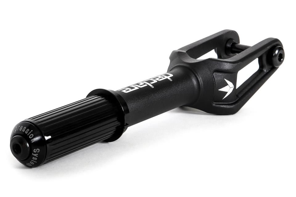La horquilla BLUNT Declare V2 SCS con acabado en negro es el modelo elegido por los ciclistas que buscan un rendimiento de alto nivel y al mismo tiempo disponer de un equipo elegante y duradero. Fabricada en aluminio CNC 6063, esta horquilla garantiza una gran resistencia sin dejar de ser relativamente ligera, ideal para ciclistas que practican en entornos exigentes como el parque o la calle. Disponible en tres colores de moda (Negro, Oil Slick y Plata), permite a los conductores personalizar su scooter mientras se benefician de un rendimiento óptimo.Su sistema de compresión SCS permite una instalación sencilla y rápida, al tiempo que garantiza una mayor estabilidad y durabilidad. Con un cuidado diseño y un offset de 10 mm, la Declare V2 SCS está diseñada para ciclistas que buscan una horquilla a la vez estética y de altas prestaciones, capaz de soportar los impactos de los trucos más técnicos. Su compatibilidad con ruedas de hasta 125 mm de diámetro la convierte en una elección perfecta para ciclistas que buscan versatilidad y resistencia.Ya sea para un estilo urbano o para sesiones intensas en el parque, esta horquilla no te decepcionará. Forma parte de la gama de productos BLUNT, marca reconocida por su calidad e innovación en el mundo del scooter freestyle.