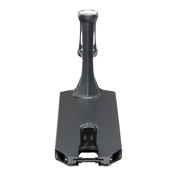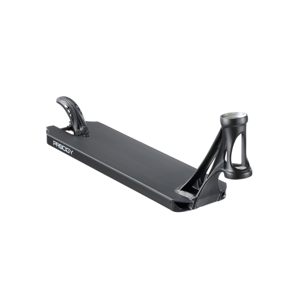 DescripciónBase Blunt Prodigy X scooter freestyle – geometría optimizada y respuesta directaConstrucción Extech: menos peso, misma exigenciaLa Blunt Prodigy X Deck introduce la nueva extrusión Extech, diseñada para reducir material donde no aporta resistencia y reforzar las zonas críticas. El resultado es una base de 1250 g, donde se aprecia un equilibrio claro entre ligereza y durabilidad real para riding intensivo. No es una reducción estética, se percibe en la rapidez de reacción en trucos y cambios de dirección.Geometría orientada al controlCon unas dimensiones de 5” x 18.5”, esta base se posiciona en un punto intermedio que permite adaptarse a distintos estilos. No es excesivamente ancha, lo que mantiene agilidad, pero ofrece suficiente plataforma para estabilidad. El footspace de 13.5” está bien aprovechado, permitiendo una colocación natural del pie sin sensación de limitación.Headtube y estructura: rigidez funcionalEl headtube con angulación de 83.5° aporta una dirección más precisa y directa, especialmente en park o transiciones rápidas. Visualmente destaca su diseño estilizado con refuerzos laterales, pero lo relevante es la transferencia de energía sin flexiones innecesarias. La estructura general presenta un diseño más boxy, con paredes internas reforzadas que mejoran la resistencia frente a impactos.Concave agresivo y sensación bajo el pieEl concave es claramente marcado, algo que se aprecia tanto visualmente como en uso. Este detalle mejora el control del pie en recepciones y grinds, evitando desplazamientos involuntarios. No es un concave plano, está pensado para riders que buscan precisión en cada apoyo.Dropouts y compatibilidad con pegsEl diseño peg-cut junto con los dropouts angulados facilita la instalación de pegs sin comprometer la estructura. Además, incorpora nylon inserts, que ayudan a reducir desgaste en la zona trasera y aportan un deslizamiento más limpio en ciertos trucos.Detalles estéticos y acabadoA nivel visual, la base mantiene una línea sobria en negro con gráficos discretos “PRODIGY”. En la parte inferior, el diseño gráfico aporta contraste sin sobrecargar el conjunto. Se percibe un enfoque técnico, donde la estética acompaña pero no condiciona la funcionalidad.Especificaciones técnicasLa Blunt Prodigy X Deck tiene unas medidas de 19.5” de largo y 5” de ancho, un peso de 1250 g, angulación de 83.5°, diseño peg-cut, y freno Blunt Nylon Brake V2. No incluye lija y dispone de un footspace de 13.5”.