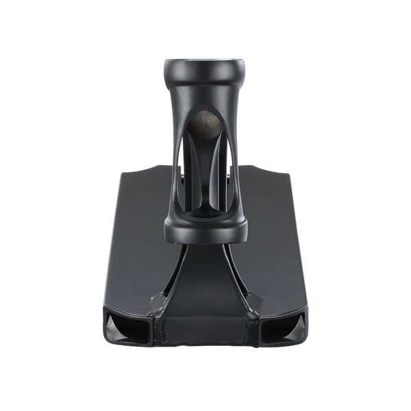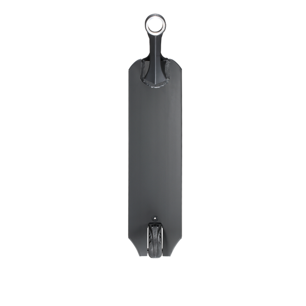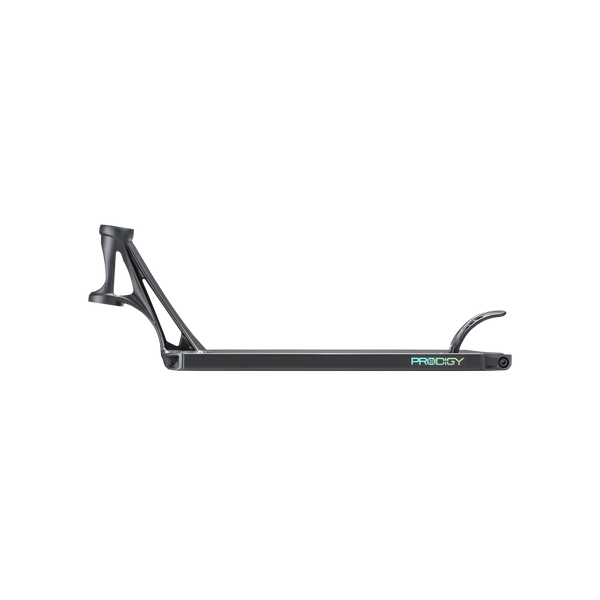 DescripciónBase Blunt Prodigy X scooter freestyle – geometría optimizada y respuesta directaConstrucción Extech: menos peso, misma exigenciaLa Blunt Prodigy X Deck introduce la nueva extrusión Extech, diseñada para reducir material donde no aporta resistencia y reforzar las zonas críticas. El resultado es una base de 1250 g, donde se aprecia un equilibrio claro entre ligereza y durabilidad real para riding intensivo. No es una reducción estética, se percibe en la rapidez de reacción en trucos y cambios de dirección.Geometría orientada al controlCon unas dimensiones de 5” x 19.5”, esta base se posiciona en un punto intermedio que permite adaptarse a distintos estilos. No es excesivamente ancha, lo que mantiene agilidad, pero ofrece suficiente plataforma para estabilidad. El footspace de 13.5” está bien aprovechado, permitiendo una colocación natural del pie sin sensación de limitación.Headtube y estructura: rigidez funcionalEl headtube con angulación de 83.5° aporta una dirección más precisa y directa, especialmente en park o transiciones rápidas. Visualmente destaca su diseño estilizado con refuerzos laterales, pero lo relevante es la transferencia de energía sin flexiones innecesarias. La estructura general presenta un diseño más boxy, con paredes internas reforzadas que mejoran la resistencia frente a impactos.Concave agresivo y sensación bajo el pieEl concave es claramente marcado, algo que se aprecia tanto visualmente como en uso. Este detalle mejora el control del pie en recepciones y grinds, evitando desplazamientos involuntarios. No es un concave plano, está pensado para riders que buscan precisión en cada apoyo.Dropouts y compatibilidad con pegsEl diseño peg-cut junto con los dropouts angulados facilita la instalación de pegs sin comprometer la estructura. Además, incorpora nylon inserts, que ayudan a reducir desgaste en la zona trasera y aportan un deslizamiento más limpio en ciertos trucos.Detalles estéticos y acabadoA nivel visual, la base mantiene una línea sobria en negro con gráficos discretos “PRODIGY”. En la parte inferior, el diseño gráfico aporta contraste sin sobrecargar el conjunto. Se percibe un enfoque técnico, donde la estética acompaña pero no condiciona la funcionalidad.Especificaciones técnicasLa Blunt Prodigy X Deck tiene unas medidas de 19.5” de largo y 5” de ancho, un peso de 1250 g, angulación de 83.5°, diseño peg-cut, y freno Blunt Nylon Brake V2. No incluye lija y dispone de un footspace de 13.5”.