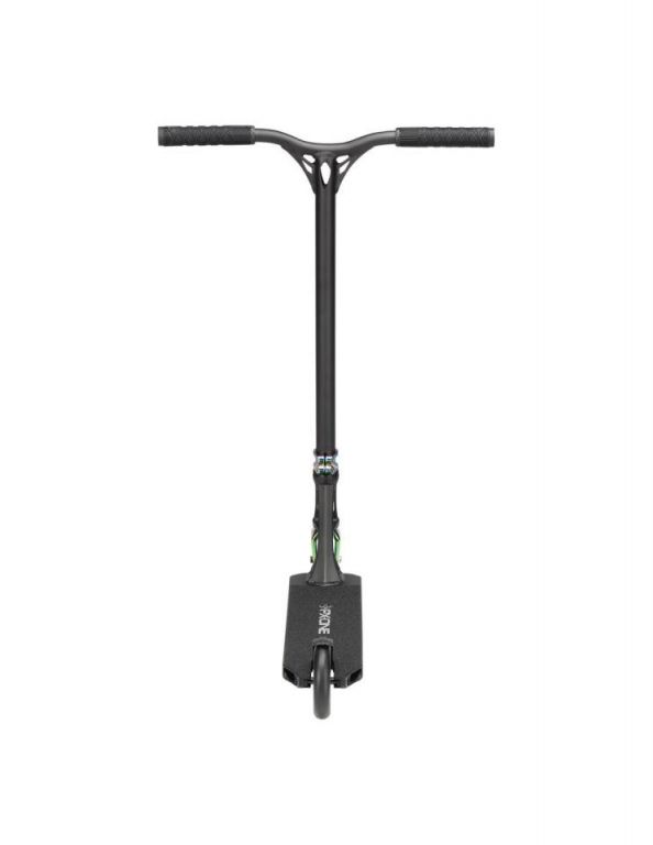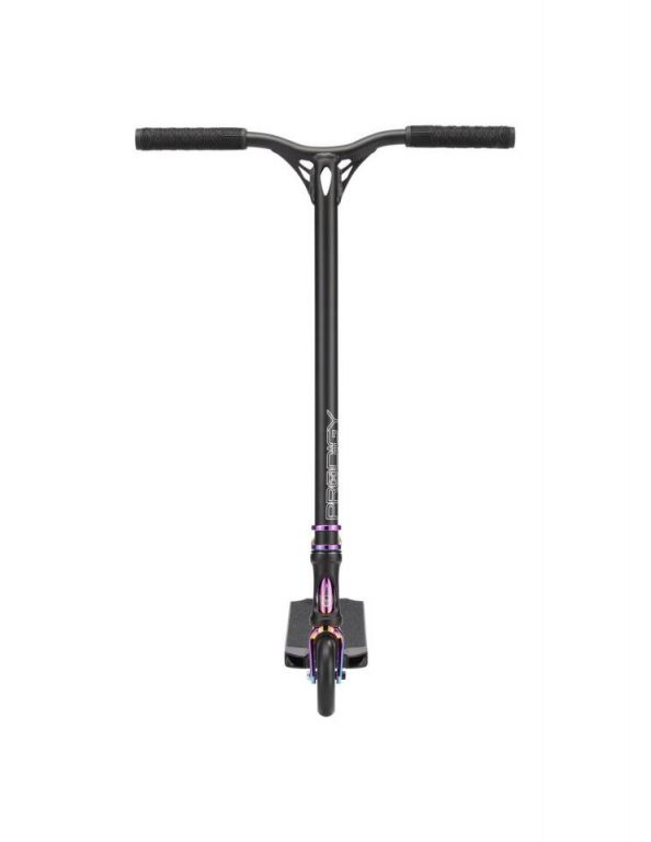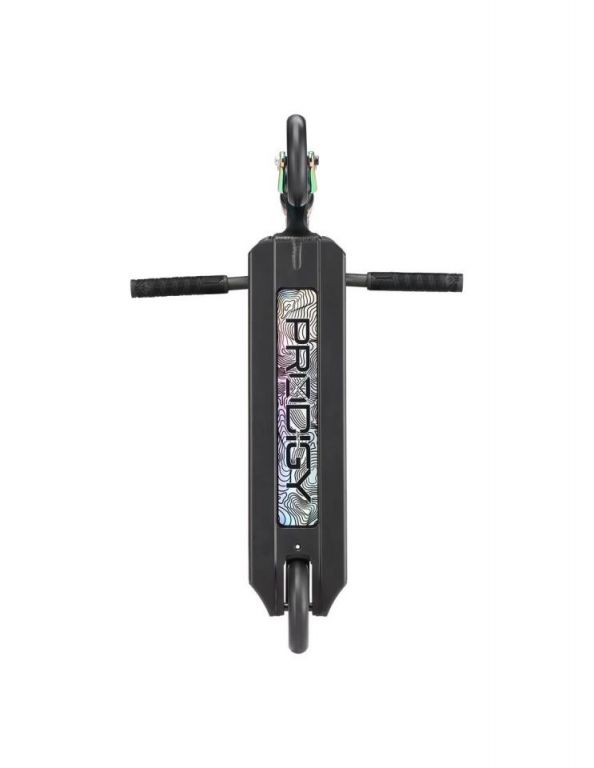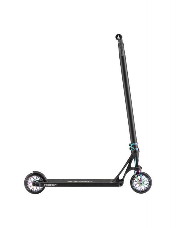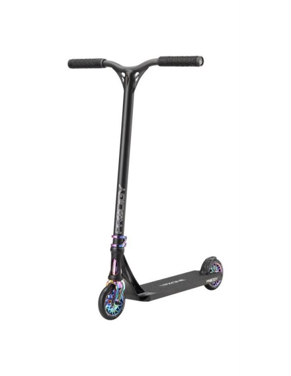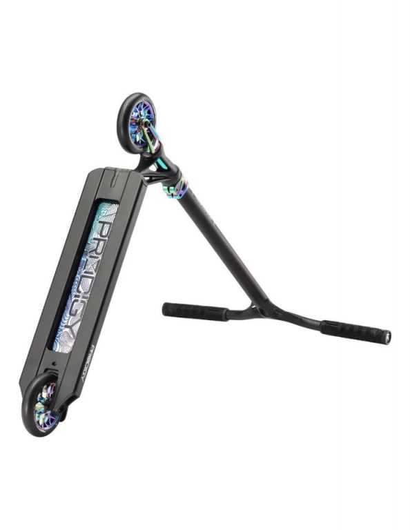 DescripciónBlunt Prodigy X One scooter freestyle completo con ruedas 120 mm y sistema IHCDeck 5” con Extech extrusion: equilibrio entre park y streetEl Blunt Prodigy X One utiliza un deck de 127 mm de ancho y 495 mm de largo, una medida más equilibrada que permite adaptarse tanto a park como a street ligero.La construcción Extech extrusion introduce paredes internas más anchas, perfil bajo y estructura más rígida. El resultado es un deck más reactivo, con mejor transmisión de energía en impulsos y recepciones.El concave marcado mejora el control del pie, mientras que el espacio útil de 345 mm mantiene una plataforma compacta y manejable.Ruedas 120 mm x 26 mm: más velocidad y estabilidadLas ruedas 120 mm x 26 mm en dureza 86A están orientadas a mantener velocidad y estabilidad en rodadura.El mayor diámetro permite rodar más rápido con menos esfuerzo, mientras que el ancho de 26 mm mejora el contacto con el suelo, aportando control en curvas y recepciones.Sistema IHC: ligereza y respuesta directaEl sistema de compresión IHC combinado con la horquilla Declare V2 reduce peso respecto a configuraciones SCS, manteniendo una buena rigidez estructural.La horquilla incluye eje reforzado y sistema de fijación mejorado, pensado para mantener el ajuste en uso continuado.Manillar aluminio Reaper V3: reducción de peso sin perder controlEl manillar Reaper V3 style de 620 mm de alto y 560 mm de ancho está fabricado en aluminio, lo que reduce el peso total del scooter.Esta configuración favorece un manejo más rápido, especialmente en park y trucos aéreos, sin perder estabilidad en uso general.Componentes y mejoras estructuralesEl rediseño del headtube mejora la unión con el deck mediante un refuerzo adicional, aumentando la resistencia estructural.La lija OS46 de carburo de silicio ofrece mayor agarre, mientras que los deck plugs de nylon y el freno V2 mantienen una configuración ligera y funcional.Los puños TPR V3, más largos y gruesos, mejoran el agarre y la comodidad durante la sesión.Acabados disponiblesEl modelo está disponible en cinco versiones:Oil Slick: anodizado multicolor con patrón BluntBlack/Oil Slick: combinación de negro mate con detalles anodizadosOrange: acabado metálico anodizado en tono naranjaBlue: anodizado azul con degradado grisSilver: acabado metálico plateado con detalles en azul