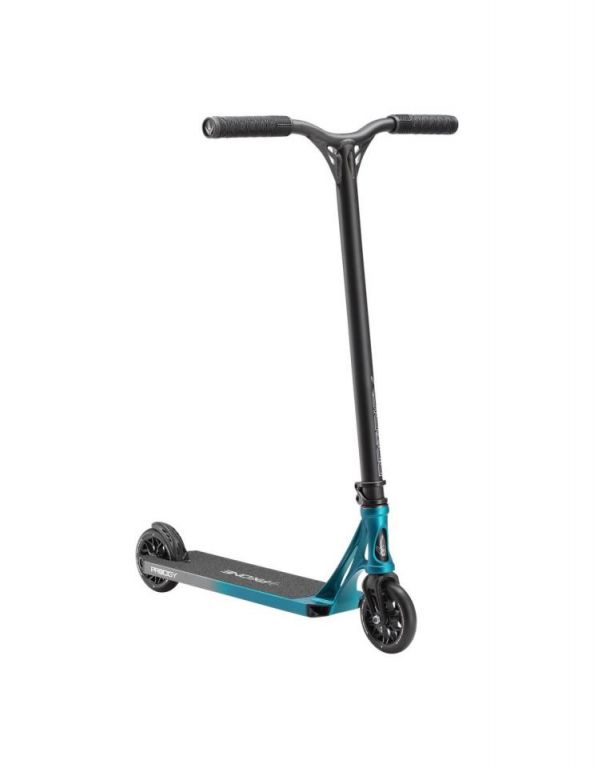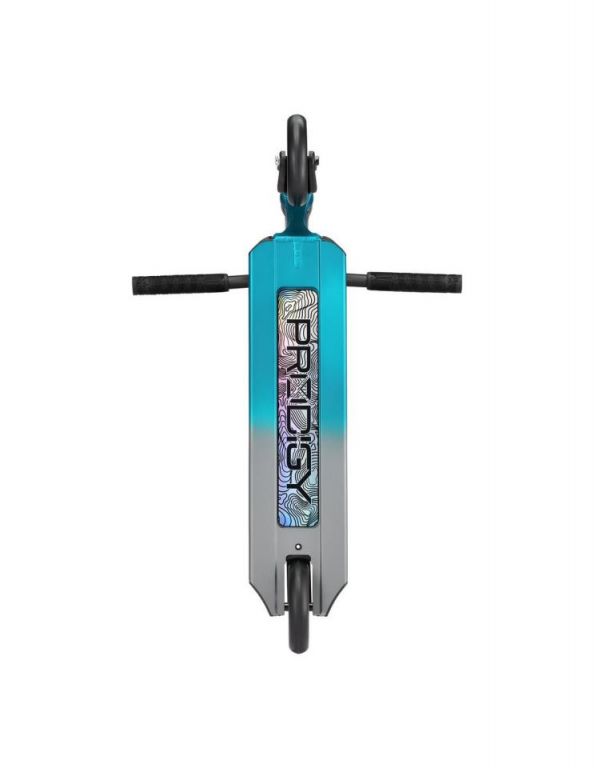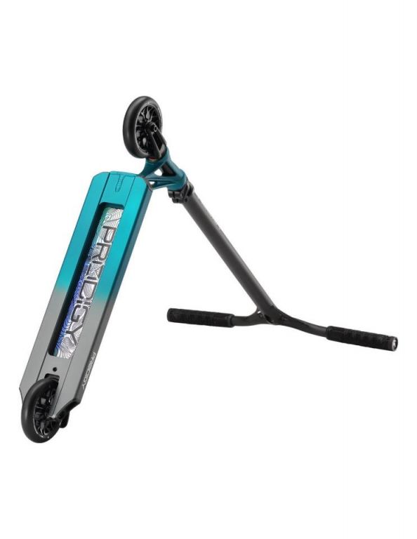 DescripciónBlunt Prodigy X One scooter freestyle completo con ruedas 120 mm y sistema IHCDeck 5” con Extech extrusion: equilibrio entre park y streetEl Blunt Prodigy X One utiliza un deck de 127 mm de ancho y 495 mm de largo, una medida más equilibrada que permite adaptarse tanto a park como a street ligero.La construcción Extech extrusion introduce paredes internas más anchas, perfil bajo y estructura más rígida. El resultado es un deck más reactivo, con mejor transmisión de energía en impulsos y recepciones.El concave marcado mejora el control del pie, mientras que el espacio útil de 345 mm mantiene una plataforma compacta y manejable.Ruedas 120 mm x 26 mm: más velocidad y estabilidadLas ruedas 120 mm x 26 mm en dureza 86A están orientadas a mantener velocidad y estabilidad en rodadura.El mayor diámetro permite rodar más rápido con menos esfuerzo, mientras que el ancho de 26 mm mejora el contacto con el suelo, aportando control en curvas y recepciones.Sistema IHC: ligereza y respuesta directaEl sistema de compresión IHC combinado con la horquilla Declare V2 reduce peso respecto a configuraciones SCS, manteniendo una buena rigidez estructural.La horquilla incluye eje reforzado y sistema de fijación mejorado, pensado para mantener el ajuste en uso continuado.Manillar aluminio Reaper V3: reducción de peso sin perder controlEl manillar Reaper V3 style de 620 mm de alto y 560 mm de ancho está fabricado en aluminio, lo que reduce el peso total del scooter.Esta configuración favorece un manejo más rápido, especialmente en park y trucos aéreos, sin perder estabilidad en uso general.Componentes y mejoras estructuralesEl rediseño del headtube mejora la unión con el deck mediante un refuerzo adicional, aumentando la resistencia estructural.La lija OS46 de carburo de silicio ofrece mayor agarre, mientras que los deck plugs de nylon y el freno V2 mantienen una configuración ligera y funcional.Los puños TPR V3, más largos y gruesos, mejoran el agarre y la comodidad durante la sesión.Acabados disponiblesEl modelo está disponible en cinco versiones:Oil Slick: anodizado multicolor con patrón BluntBlack/Oil Slick: combinación de negro mate con detalles anodizadosOrange: acabado metálico anodizado en tono naranjaBlue: anodizado azul con degradado grisSilver: acabado metálico plateado con detalles en azul